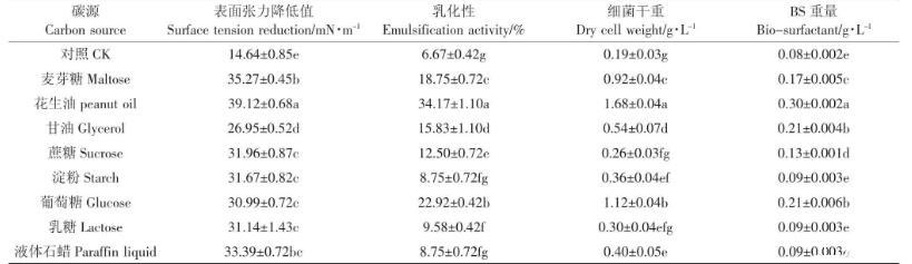 碳源對細菌的生長與發酵產物量有重要影響。銅綠假單胞菌(Pseudomonas aeruginosa)可在多種類型碳源下產生生物表面活性劑,包括甘油、乙醇、植物油等。由表3可知,以花生油為碳源,細菌發酵液的降低值為39.12 mN·m-1,明顯高于其他碳源類型;乳化值為34.17%,稍高于其他碳源,此時細菌生物量最大,糖脂含量最高,為0.30 g·L-1。雖然花生油作為碳源,能夠促進菌株產生更多生物表面活性劑,但如果用于實際生產,成本相對較高,近年來一些研究者嘗試使用成本較低的工業副產物如糖蜜、廢潤滑油等作為碳源,發現也具有很好的促進微生物產生生物表面活性劑的作用。因此,后期會考慮選擇用一些低成本碳源進行發酵。