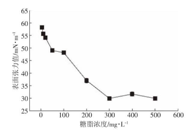 發酵產物臨界膠束濃度是指分子在溶劑中締合形成膠束的最低濃度。臨界膠束濃度(Critical micelle0.005 concentration,CMC)可以作為表面活性劑表面活性的一種度量,CMC越小,改變表/界面性質,起到增溶、乳化等所需的濃度就越低。從圖3可以看出:糖脂在0~300 mg·L-1時,表面張力值隨著糖脂濃度的升高而降低,且在300 mg·L-1時達到最小值;在300~500 mg·L-1時,表面張力值變化不大。可得發酵粗提產物的CMC為300 mg·L-1,明顯低于普通化學表面活性劑十二烷基磺酸鈉(SDS)的2200 mg·L-1,能在較低濃度下使用,因而在醫藥、食品、化工等行業具有廣闊應用前景。