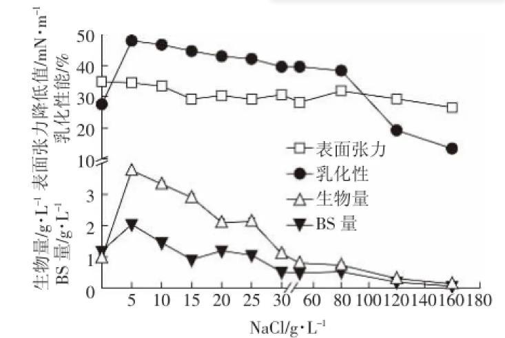 NaCl濃度通過改變細(xì)胞滲透壓影響微生物的生長(zhǎng)與代謝,從而影響發(fā)酵產(chǎn)物的產(chǎn)量。由圖6可見,鹽濃度在0~5 g·L-1之間,細(xì)菌生長(zhǎng)受到促進(jìn),而當(dāng)鹽濃度大于5 g·L-1時(shí),細(xì)菌的生長(zhǎng)受到抑制,糖脂量與生物量趨勢(shì)一致。菌株的生物量、生物表面活性劑量、表面張力值與乳化性均在鹽濃度為5 g·L-1時(shí)呈現(xiàn)最大,說明該菌株具有一定的耐鹽性,與強(qiáng)婧等研究的生物表面活性劑產(chǎn)生菌Pseudomonas aeruginosa S6也能夠耐鹽相似。此外,本菌株在最高為25 g·L-1的鹽濃度條件下依然能夠存活,但此時(shí)已不能產(chǎn)生更多的生物表面活性劑。