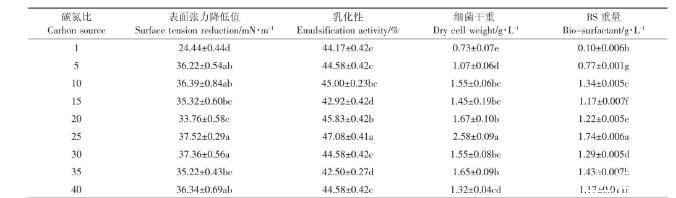 表5碳氮比對(duì)147細(xì)菌生長(zhǎng)以及生物表面活性劑產(chǎn)量的影響