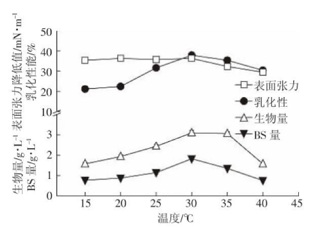溫度是影響菌株發(fā)酵產(chǎn)物產(chǎn)量的重要環(huán)境因素之一。不同細(xì)菌的最適生長(zhǎng)溫度不同。一般細(xì)菌在4℃停止生長(zhǎng),在30℃左右生長(zhǎng)良好。已報(bào)道的銅綠假單胞菌(Pseudomonas aeruginosa)最適溫度一般在27~37℃。由圖4可以看到,表面張力值、生物量和生物表面活性劑產(chǎn)量都隨著溫度的升高呈現(xiàn)先升高后降低的趨勢(shì),在30℃時(shí)達(dá)到最大。乳化性在15℃到30℃時(shí)保持相對(duì)穩(wěn)定,在30℃到40℃時(shí)乳化性降低。實(shí)際上大多數(shù)銅綠假單胞菌的最佳培養(yǎng)溫度都在27~37℃,與實(shí)驗(yàn)結(jié)果相符。