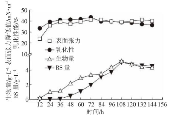 在上述花生油25 mL·L-1為碳源、硫酸銨1 g·L-1為氮源、NaCl濃度為5 g·L-1、pH=8、溫度保持為30℃的最佳培養(yǎng)條件下,追蹤細(xì)菌147的發(fā)酵動(dòng)態(tài)(圖7)。菌株經(jīng)過短暫的延滯期后進(jìn)入對(duì)數(shù)生長(zhǎng)期,108 h后進(jìn)入穩(wěn)定增長(zhǎng)期,此時(shí)菌體所產(chǎn)生的生物表面活性劑含量達(dá)到最大,此后生物表面活性劑含量減少,可能是因?yàn)楹笃谂囵B(yǎng)基內(nèi)的碳源已經(jīng)用盡,細(xì)菌開始以胞外分泌物糖脂為碳源維持生命。而表面張力值與乳化性在24 h后達(dá)到最大,之后維持在穩(wěn)定水平,說明細(xì)菌在24 h后產(chǎn)生的生物表面活性劑已到達(dá)生物表面活性劑的臨界膠束濃度,此后生物表面活性劑產(chǎn)量還會(huì)增加,但是表面張力降低值與乳化性只維持在一定范圍內(nèi)波動(dòng)。