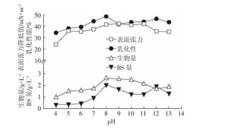 pH值也是影響菌株發(fā)酵產(chǎn)物產(chǎn)量的因素之一。由圖5可見,細(xì)菌的生物量在pH=8的時(shí)候達(dá)到最大,且在pH8~10的時(shí)候基本平穩(wěn);表面張力值、生物表面活性劑含量與乳化性均在pH=8的時(shí)候達(dá)到最大值,兩側(cè)均有不同程度的下降。因此該菌株傾向偏堿性的條件生存,與強(qiáng)婧等篩選的Pseudomonas aeruginosa S6最適pH一致。綜合其他報(bào)道的生物表面活性劑產(chǎn)生菌的最適pH范圍,大部分微生物都在pH6.2~8之間。