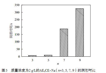 從圖5中可以得到,AEnCE-Na的潤濕時間隨EO加合數的增大而增大,也就是說,潤濕能力隨EO數的增大而逐漸減弱,這主要是親水性增強的結果。其中,AE3CE-Na和AE5CE-Na的潤濕時間均小于10 s,樣品的潤濕性能較好。