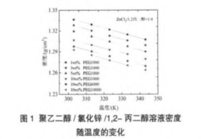 圖1聚乙二醇/氯化鋅/1,2-丙二醇溶液密度隨溫度的變化
