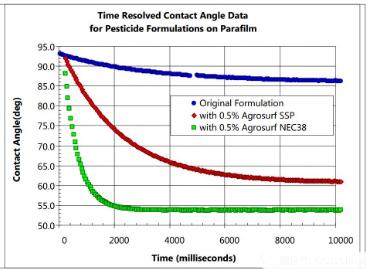 每種配方的初始接觸角大約為90°,原始配方平衡接觸角為86°,添加了Agrosurf SSP后的農藥,平衡接觸角降到61°,而添加了Agrosurf NEC38后,接觸角降低更快,平衡后為54°。
