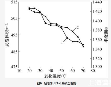 將起泡劑溶液在一定溫度下老化一定時(shí)間后,測(cè)試其發(fā)泡體積和泡沫半衰期的變化以評(píng)價(jià)其抗溫性能。稱取0.2 g起泡劑ULT-1于攪拌杯中,加入100 mL蒸餾水,置于攪拌器之上,以轉(zhuǎn)速11 000 r/min攪拌1 min。裝入老化罐,放入滾子加熱爐,在一定溫度下滾動(dòng)16 h,取出冷卻至室溫,以轉(zhuǎn)速11 000 r/min攪拌1 min,測(cè)量發(fā)泡體積和半衰期。通過(guò)改變老化溫度測(cè)量起泡性能與老化溫度的關(guān)系,結(jié)果如圖9所示。從圖9可知:0.2%的新型起泡劑溶液在一定溫度范圍內(nèi)(20~70℃),隨著老化溫度的升高起泡性能基本不變,表明研制的新型起泡劑ULT-1具有較好的抗溫性能。