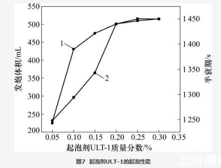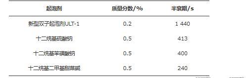 起泡性能主要是指起泡能力和泡沫穩(wěn)定性。發(fā)泡體積V0反映了起泡能力,析液半衰期t1/2反映了泡沫穩(wěn)定性。在室溫下,稱取一定質(zhì)量的起泡劑ULT-1于攪拌杯中,加入100 mL蒸餾水,置于攪拌器之上,以轉(zhuǎn)速11 000 r/min攪拌1 min。攪拌完畢后,立即取下攪拌杯,同時(shí)啟動(dòng)秒表,開(kāi)始記錄消泡時(shí)間,將攪拌杯中的所有物質(zhì)全部倒入1 000 mL量筒中,讀取發(fā)泡體積和從泡沫中析出50 mL液體的時(shí)間,即為半衰期。通過(guò)改變起泡劑ULT-1的質(zhì)量測(cè)量起泡性能與起泡劑質(zhì)量分?jǐn)?shù)的關(guān)系,結(jié)果如圖7所示。從圖7可知:隨起泡劑ULT-1質(zhì)量分?jǐn)?shù)的提高,發(fā)泡體積增加幅度較大,半衰期緩慢增加。當(dāng)ULT-1質(zhì)量分?jǐn)?shù)升到0.2%時(shí),發(fā)泡體積達(dá)到501 mL,半衰期達(dá)到1 440 s,繼續(xù)提高質(zhì)量分?jǐn)?shù)發(fā)泡體積和半衰期基本不變,表明研制的新型起泡劑ULT-1低濃度時(shí)即具有較高的起泡性能,發(fā)泡體積高,泡沫半衰期長(zhǎng)。同時(shí),對(duì)比評(píng)價(jià)了常用起泡劑的半衰期,結(jié)果如表1所示。從表1可知:質(zhì)量分?jǐn)?shù)為0.2%的起泡劑ULT-1與質(zhì)量分?jǐn)?shù)為0.5%的常規(guī)起泡劑相比,泡沫半衰期可提高3倍以上。