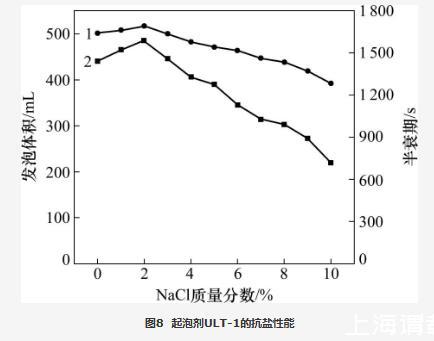 利用抗NaCl污染的能力評(píng)價(jià)質(zhì)量分?jǐn)?shù)為0.2%起泡劑ULT-1水溶液的抗鹽性能。在室溫下,稱取0.2 g起泡劑ULT-1于攪拌杯中,加入100 mL蒸餾水,置于攪拌器之上,以轉(zhuǎn)速11 000 r/min攪拌1 min。直接加入一定量的NaCl,以轉(zhuǎn)速11 000 r/min攪拌1 min,測(cè)量發(fā)泡體積和半衰期。通過(guò)改變NaCl的質(zhì)量分?jǐn)?shù)測(cè)量起泡性能,結(jié)果如圖8所示。從圖8可知:當(dāng)NaCl質(zhì)量分?jǐn)?shù)在2%以內(nèi)時(shí),發(fā)泡體積和半衰期緩慢增大,當(dāng)NaCl質(zhì)量分?jǐn)?shù)繼續(xù)增大時(shí),發(fā)泡體積和半衰期緩慢降低;當(dāng)NaCl質(zhì)量分?jǐn)?shù)達(dá)10%時(shí),發(fā)泡體積和半衰期仍能保持較高水平,表明研制的新型起泡劑ULT-1具有較好的抗鹽性能。