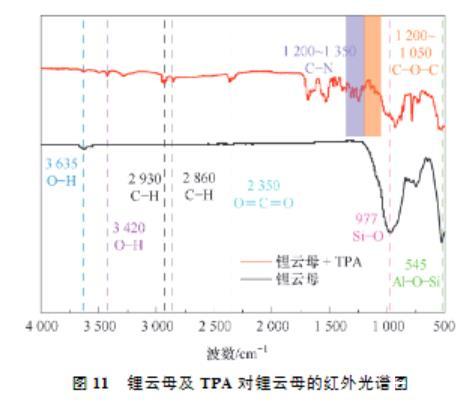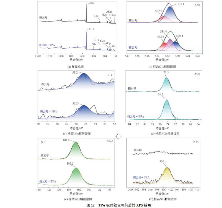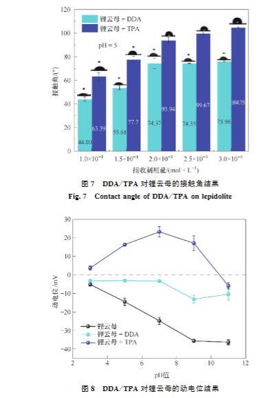 (2)接觸角試驗表明,同等條件下,TPA作用鋰云母的接觸角總是大于DDA,展現(xiàn)了TPA更強的疏水性。Zeta電位測試結(jié)果表明,TPA及DDA在鋰云母表面的吸附為靜電吸附,并且碳鏈更長的TPA由于疏水效應(yīng)吸附性更好,進(jìn)一步證明了TPA的強疏水性。FTIR及XPS進(jìn)一步證實了TPA吸附在鋰云母表面。