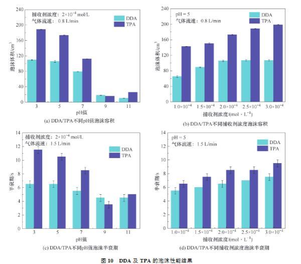 (3)在不同濃度下,TPA均得到比DDA更低的表面張力,說明TPA可能具有更多的泡沫容積,泡沫容積結(jié)果驗證了表面張力結(jié)果。在不同濃度下,TPA均得到比DDA更高的黏度,說明TPA產(chǎn)生的泡沫更穩(wěn)定,泡沫半衰期結(jié)果驗證了黏度結(jié)果。表面張力試驗、黏度試驗、泡沫容積試驗、泡沫半衰期試驗共同證明TPA更優(yōu)越的泡沫性能。將TPA應(yīng)用于浮選中,能夠增大氣泡與鋰云母的碰撞及接觸概率,增強鋰云母與氣泡的黏附,減少鋰云母與氣泡的脫附,進(jìn)而提高浮選回收率。