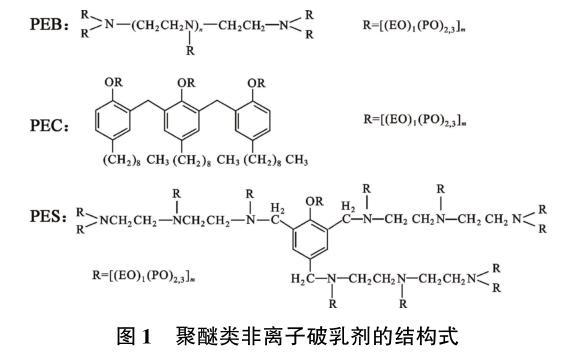 實驗用破乳劑HY01是季銨鹽類陽離子破乳劑,相對分子質量約6 000,固含量約35%;其他破乳劑為聚醚類非離子表面活性劑,平均相對分子質量均在5 000左右,EO(乙氧基)∶PO(丙氧基)=1∶2.3。3種聚醚類非離子破乳劑的結構式見圖1,其中PEB是支狀聚醚類非離子破乳劑,屬于多乙烯多胺聚氧乙烯聚氧丙烯醚型破乳劑,PEC是梳型聚醚類非離子破乳劑,屬于酚醛樹脂聚氧乙烯聚氧丙烯醚型破乳劑,PES是星型聚醚類非離子破乳劑,屬于酚胺醛樹脂聚氧乙烯聚氧丙烯醚型破乳劑。