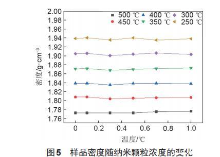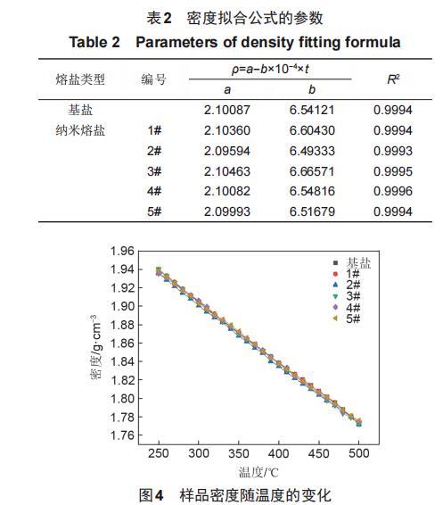 研究表明,在solar salt中加入SiO_2納米顆粒后,熔點會有一定程度的下降,分解溫度會有一定程度的提高。并且solar salt的熔點為218.2℃,所以當熔鹽加熱到250℃時,已經完全熔化;當熔鹽溫度超過600℃時,熔鹽會開始分解。溫度較高和溫度較低都會對實驗測量的數據產生影響,造成較大的實驗誤差。因此基鹽及納米熔鹽密度實驗數據測定范圍為260~500℃。