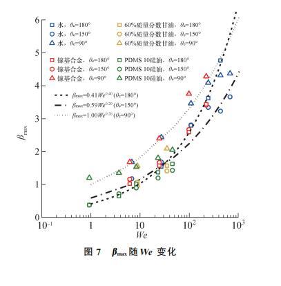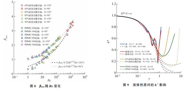 如表1所示,文指出在黏性力主導區(P>1)存在規律βmax∝Re0.2.本文在黏性力區的研究采用3種質量分數的甘油溶液、3種型號的PDMS甘油,黏度變化范圍為10——970 mPa·s,跨越近3個數量級。其中,黏度極高的PDMS1000硅油在低速碰撞壁面時有Re=1.
