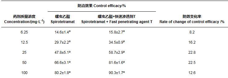 表5添加快速滲透劑T后22.4%螺蟲乙酯懸浮劑對石斛菲盾蚧田間防效的變化