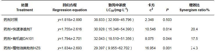 2.3噴霧助劑對2種藥劑防治石斛菲盾蚧室內毒力的增效作用
