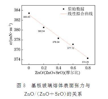 圖8 基板玻璃熔體表面張力與ZnO/(ZnO+SrO)的關系