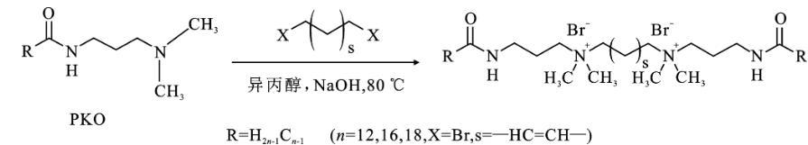 根據(jù)前期的工作[2-4]。在圓底燒瓶中,先將0.1 mol連接基化合物,反-1,4-二溴-2-丁烯溶于100 mL異丙醇中。將0.2 mol脂肪酸酰胺丙基二甲胺(PKO-12、PKO-16、PKO-18)加入反應溶液中,并以氫氧化鈉0.4 g作為催化劑加速反應,在80℃下攪拌12 h。反應結束后,用真空蒸發(fā)去除溶劑,得到蠟狀的粗產物。將得到的蠟狀粗品固體在乙酸乙酯/乙醇(20∶1)混合溶劑中重結晶3次,得到白色粉末狀陽離子Gemini表面活性劑。所制備的Gemini表面活性劑(GS-12,GS-16,GS-18)的產率分別為93.5%,92.4%,94.1%。Gemini表面活性劑GS-12,GS-16,GS-18的合成路線如下: