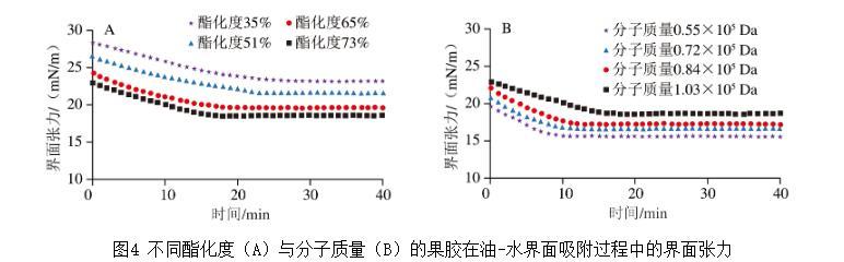 圖4不同酯化度(A)與分子質(zhì)量(B)的果膠在油-水界面吸附過程中的界面張力