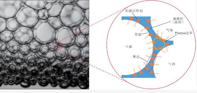 泡沫是一種熱力學(xué)不穩(wěn)定的膠體體系,其中氣體分散在表面活性劑穩(wěn)定的連續(xù)液相中,可以自發(fā)破裂。圖1顯示由表面活性劑形成的典型泡沫結(jié)構(gòu)。提高CO2泡沫的穩(wěn)定性具有挑戰(zhàn)性,因?yàn)樵诟邏簝訔l件下,CO2更易溶于水,溶解的CO2會引起泡沫的團(tuán)聚。