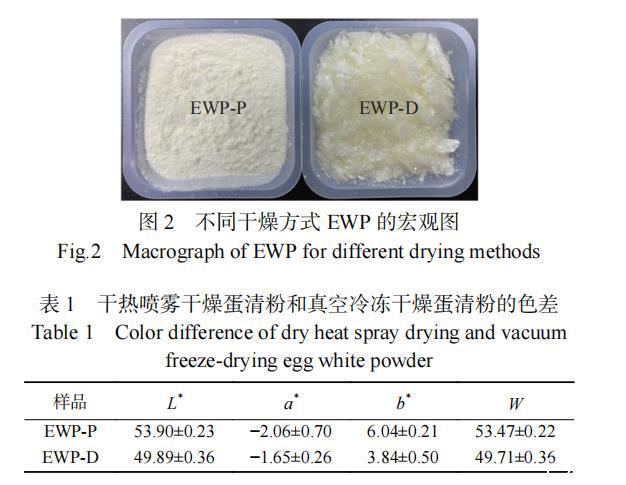 如圖2所示,EWP-P為細(xì)膩的鵝黃色顆粒粉末,EWP-D為松散的黃色片狀物。EWP-P的L*、a*和b*值分別為53.90±0.23、?2.06±0.70和6.04±0.21。EWP-D的L*、a*和b*值分別為49.89±0.36、?1.65±0.26和3.84±0.50(表1)。EWP-P的b*值較大是因?yàn)榈扒宓鞍字械钠咸烟窃趪婌F干燥過程中與蛋白發(fā)生了美拉德反應(yīng)。此外,真空冷凍干燥需將樣品進(jìn)行冷凍預(yù)處理,冷凍過程中,蛋清蛋白會發(fā)生褐變反應(yīng),故EWP-D最終呈現(xiàn)出的顏色較EWP-P黃(圖2)。EWP-P的顏色較EWP-D白(圖2),可能是因?yàn)楦蔁釃婌F干燥的干燥速度快,蛋清中的蛋白質(zhì)受熱時(shí)間短。因此在本實(shí)驗(yàn)干燥條件下,干熱噴霧干燥所得的蛋清蛋白粉更亮、更白,易被消費(fèi)者接受。