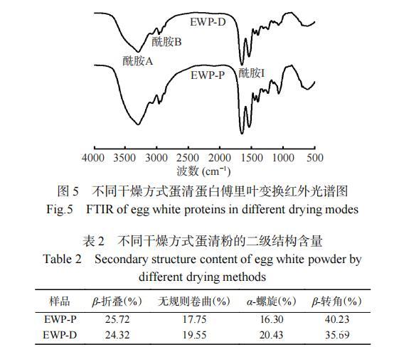 不同干燥方式蛋清蛋白的紅外光譜如圖5所示。EWP-P和EWP-D在酰胺A帶(3700~3200 cm?1)處有強(qiáng)吸收峰,EWP-P的峰強(qiáng)大于EWP-D,表明干燥方式會影響蛋清蛋白的水合能力,這可能與蛋白質(zhì)分子中N-H鍵舒展并與氫鍵形成了締合體,或蛋白質(zhì)分子與葡萄糖以共價(jià)鍵結(jié)合有關(guān)。酰胺B帶(2961.64 cm?1)的弱吸收峰主要由C-N鍵產(chǎn)生。酰胺I帶(1600~1700 cm?1)信號主要由C-O鍵伸縮振動(dòng)引起,與蛋白質(zhì)的二級結(jié)構(gòu)有關(guān),涉及β-折疊(1600~1640 cm?1)、無規(guī)則卷曲(1640~1650 cm?1)、α-螺旋(1650~1660 cm?1)和β-轉(zhuǎn)角(1660~1700 cm?1)。采用Peak fit軟件對不同干燥方式蛋清蛋白的酰胺I帶峰強(qiáng)進(jìn)行高斯曲線擬合分析,根據(jù)峰面積計(jì)算其二級結(jié)構(gòu)的相對百分含量,結(jié)果如表2。EWP-P和EWP-D的二級結(jié)構(gòu)以β-折疊和β-轉(zhuǎn)角為主,EWP-P的β-折疊含量增加主要與卵轉(zhuǎn)鐵蛋白熱變性有關(guān),同時(shí)分子間的β-折疊結(jié)構(gòu)也易轉(zhuǎn)變?yōu)棣?轉(zhuǎn)角結(jié)構(gòu)。而α-螺旋下降可能是因?yàn)闊嶙冃詫?dǎo)致α-螺旋中的氫鍵斷裂,進(jìn)而發(fā)生了解螺旋現(xiàn)象。EWP-P無規(guī)則卷曲增加,表明其部分有序結(jié)構(gòu)向無規(guī)則卷曲轉(zhuǎn)化,蛋白變性明顯,結(jié)構(gòu)的隨機(jī)性增強(qiáng)。