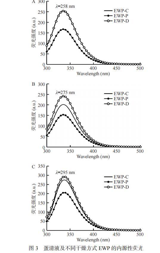 蛋白質(zhì)的固有熒光來自于內(nèi)部的芳香族氨基殘基(酪氨酸Tyr、色氨酸Trp、苯丙氨酸Phe),其熒光最大值(λmax)、強(qiáng)度對其微環(huán)境的極性極其敏感,因此可用來表征蛋白質(zhì)的三級結(jié)構(gòu)變化,其中Trp、Tyr和Phe的特有熒光激發(fā)波長分別為295、275和258 nm。如圖3所示,與EWP-C相比,不同干燥方式制備的蛋清粉的固有熒光強(qiáng)度降低但熒光峰的位置未有明顯的遷移。EWP-P的熒光強(qiáng)度低于EWP-D于EWP-C,可能是因?yàn)閲婌F干燥的干燥溫度高,蛋清蛋白變性程度大,芳香族氨基酸殘基暴露于更極性環(huán)境中,進(jìn)而發(fā)生了熒光猝滅現(xiàn)象。此外,EWP-P的熒光強(qiáng)度較低還可能是由于蛋清蛋白中含有葡萄糖,在高溫下會與蛋白質(zhì)發(fā)生美拉德反應(yīng),屏蔽了芳香族氨基殘基。