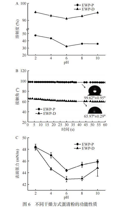 溶解性是蛋白重要的功能特性之一,與接觸角、表面張力、乳化性等密切相關(guān)。如圖6A,不同pH下不同干燥方式的蛋清粉溶解度的測量。EWP-P的溶解度隨著pH的升高先減小后增大,這可能是因?yàn)樵谒嵝院蛪A性環(huán)境中球狀蛋白質(zhì)會發(fā)生部分展開,形成熔融球狀構(gòu)象,變得更加靈活,更容易與水分子作用。pH為6.0時(shí)蛋清蛋白的溶解度最低,可能是因?yàn)樵損H與蛋清蛋白中大部分蛋白的等電點(diǎn)相近,蛋白帶電荷量較少,因此容易發(fā)生沉淀。與EWP-P相比,EWP-D在pH6.0時(shí)溶解度的下降程度較小,這可能與真空冷凍干燥后蛋清蛋白的微觀結(jié)構(gòu)呈片狀,具有較大的比表面積有關(guān),也可能是因?yàn)槔鋬龈稍锏鞍踪|(zhì)在脫水過程中蛋白質(zhì)變性低,促進(jìn)了可溶性聚集物生成。EWP-D的溶解度遠(yuǎn)大于EWP-P,這是因?yàn)閲婌F干燥是直接將蛋清液霧化后再干燥,其蛋清粉表面會形成一個(gè)光滑、抗?jié)裥缘谋∧ぃ罱K導(dǎo)致蛋白的溶解性降低,復(fù)水性差且易結(jié)塊。而真空冷凍干燥經(jīng)過冷凍升華,可保持食品原有的形狀故具有很好的速溶性和復(fù)水性。Shaviklo等也發(fā)現(xiàn)噴霧干燥的含添加劑(花粉)蛋白的蛋白質(zhì)溶解度明顯低于凍干蛋白。