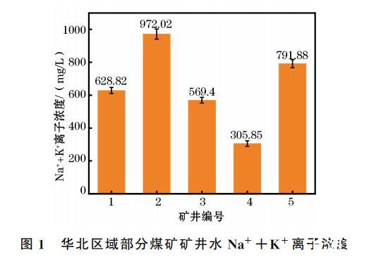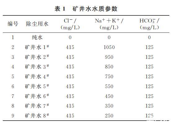 根據調研結果配制9組溶液,包括8組Na+、K+離子濃度不同的礦井水和1組純水,溶液配比見表1。配制溶液時,取適量去離子水,向其中投加CaCl2、MgCl2、Ca(HCO3)2 控制礦井水硬度,向其中投加NaCl、HCl和NaOH控制礦井水的pH為7.5,向水溶液添加其他必需微量離子和雜質,靜置2 h待用。