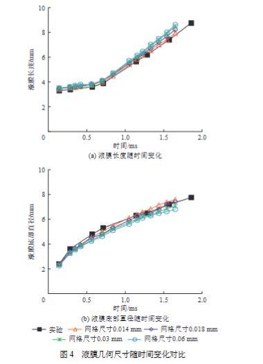 圖4液膜幾何尺寸隨時(shí)間變化對(duì)比