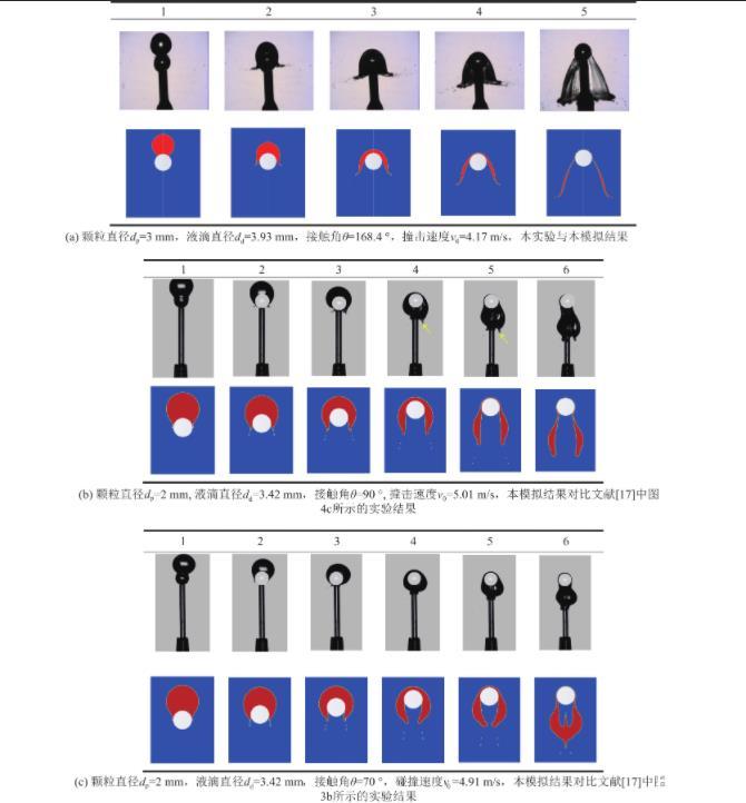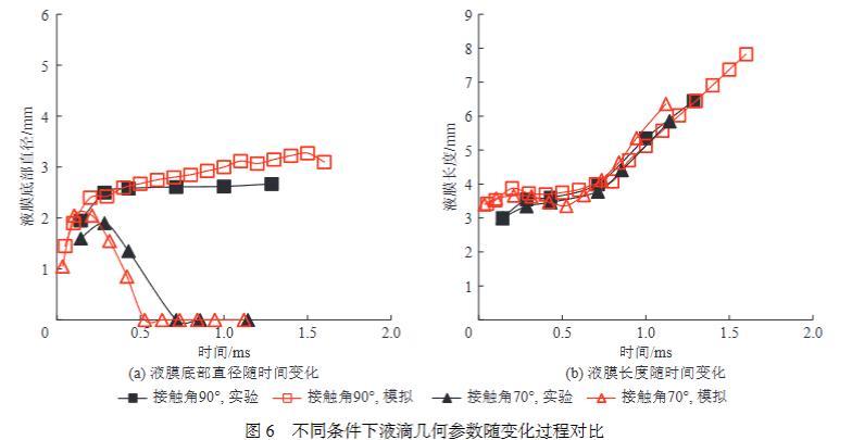 為進(jìn)一步驗(yàn)證本模型計(jì)算結(jié)果的可靠性,依據(jù)BANITABAEI等在實(shí)驗(yàn)中設(shè)置的不同碰撞條件,開(kāi)展了相應(yīng)的數(shù)值模擬。如圖5b和圖5c所示,在不同碰撞條件下,數(shù)值模擬結(jié)果中的液滴形變過(guò)程與實(shí)驗(yàn)結(jié)果均具有較高的吻合度。圖6對(duì)比了數(shù)值模擬結(jié)果與實(shí)驗(yàn)結(jié)果中液滴幾何尺寸的變化過(guò)程,也具有較高的吻合度。其中,圖6a所展示的液膜底部直徑隨時(shí)間變化曲線,數(shù)值模擬結(jié)果與實(shí)驗(yàn)結(jié)果稍有偏差,原因是實(shí)驗(yàn)中固定顆粒的支撐柱對(duì)液膜底部的形變過(guò)程產(chǎn)生了一定影響。綜上所述,可認(rèn)為筆者構(gòu)建的數(shù)值模擬模型合理,結(jié)果具有較高可靠性。由于在毫米尺度下和微米尺度下,液滴與固體顆粒的碰撞過(guò)程均遵守經(jīng)典牛頓力學(xué)定律和經(jīng)典流體力學(xué)理論,所以本數(shù)值模擬模型可用于微米尺度下的其他工況條件的數(shù)值模擬研究。