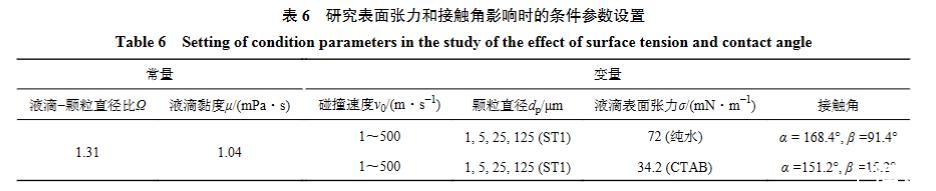 為了進(jìn)一步確定液滴潤(rùn)濕特性對(duì)液體附著比例的影響,筆者以碰撞速度、顆粒直徑和液滴表面張力(72 mN/m,34.2 mN/m)3個(gè)參數(shù)為自變量設(shè)置了不同的數(shù)值模擬條件,具體取值見(jiàn)表6。
