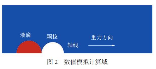 如圖2所示,液滴與顆粒對(duì)心碰撞時(shí),流場(chǎng)在演變過(guò)程將始終保持軸對(duì)稱狀態(tài),因此設(shè)置了二維軸對(duì)稱計(jì)算域。在相同的網(wǎng)格數(shù)量條件下,二維軸對(duì)稱計(jì)算域相較于三維計(jì)算域具有更好的網(wǎng)格質(zhì)量和計(jì)算精度。在分析計(jì)算結(jié)果時(shí),可以通過(guò)鏡像操作得到中軸線截面上的整體流場(chǎng)圖像。由于實(shí)驗(yàn)中最大雷諾數(shù)的數(shù)量級(jí)為104,因此,依據(jù)PASANDIDEH-FARD等的研究結(jié)果,可認(rèn)為在塵?霧碰撞過(guò)程中流場(chǎng)處于層流狀態(tài)。