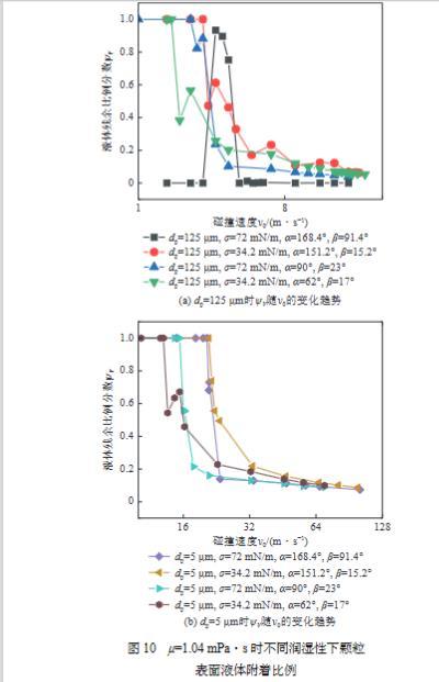 總結(jié)了霧滴—塵粒碰撞過程會發(fā)生的“反彈”、“完整聚并”、“包裹后撕裂”、“膜狀飛濺”4種行為類型,并發(fā)現(xiàn)碰撞后顆粒表面的液體附著比例變化曲線的轉(zhuǎn)折點與相應(yīng)的碰撞行為密切相關(guān)。