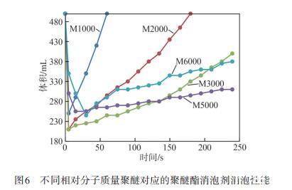 圖6不同相對(duì)分子質(zhì)量聚醚對(duì)應(yīng)的聚醚酯消泡劑消泡性能