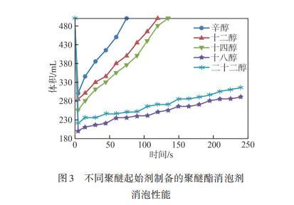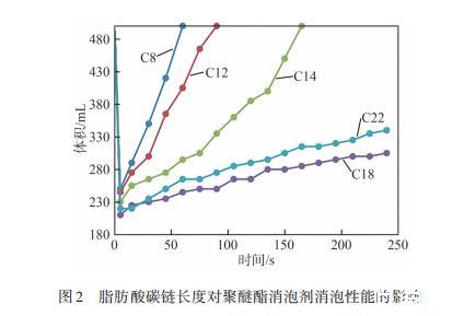 圖2脂肪酸碳鏈長(zhǎng)度對(duì)聚醚酯消泡劑消泡性能的影響