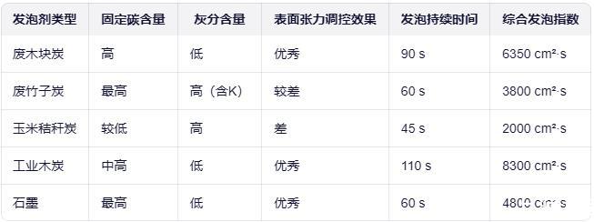 從數據可見,廢木塊炭和工業木炭因固定碳高、灰分低,表面張力調控能力優秀,發泡持續時間長,綜合性能突出。廢竹子炭雖固定碳最高,但灰分中高鉀元素導致表面張力變化過快,泡沫穩定性下降。