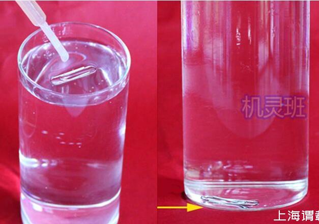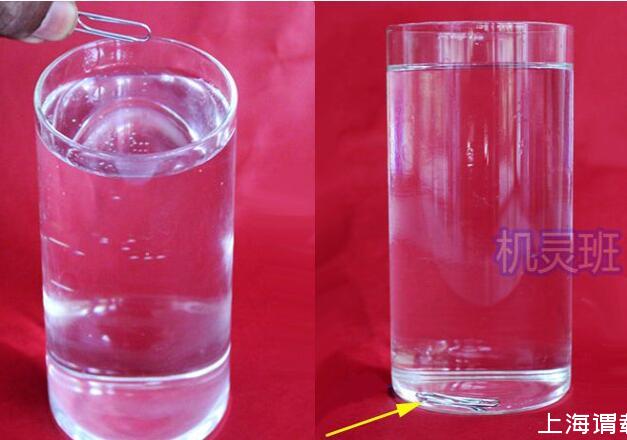 1、將回形針?lè)湃胍槐校匦吾槙?huì)下沉至玻璃杯的底部!