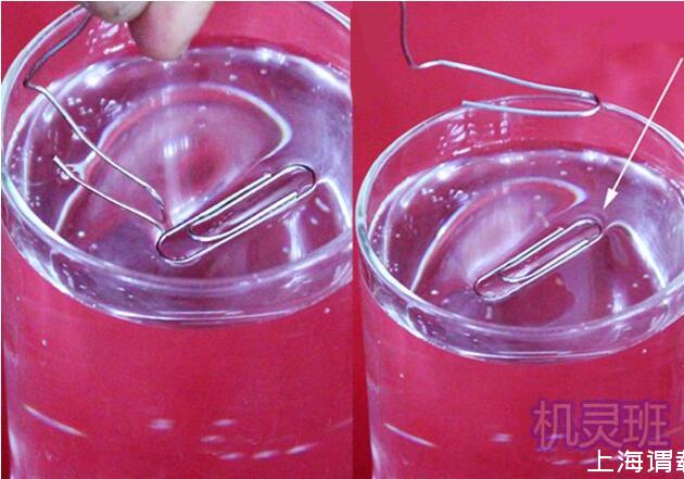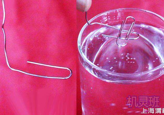 3、現(xiàn)在,將步驟2的整體回形針?biāo)降芈刭N近水面,再輕輕抽走作為支架的回形針,則你會(huì)發(fā)現(xiàn)回形針漂浮在水面上。