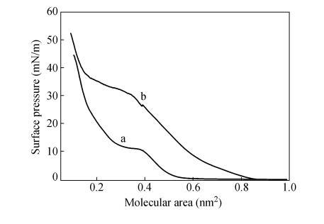 2種單體分子結(jié)構(gòu)相似,CO2DA比CODA多了一CH?-CH?O一柔性間隔基,整個(gè)分子的舒展程度相對(duì)較大。當(dāng)CODA分子在水面鋪展時(shí),與水分子的相互作用小,分子"平躺"在水面上,當(dāng)膜障壓縮單分子膜時(shí),CODA分子受到側(cè)向壓力時(shí)容易發(fā)生滑移,形成多層膜。而CO2DA分子端基親水性相對(duì)較強(qiáng),當(dāng)膜障壓縮單分子膜時(shí)分子在水面能立起來(lái),并與液面形成一定的夾角。因此CO2DA單分子膜占據(jù)面積較大,崩潰壓較高。