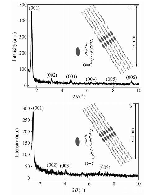 在2θ=2°~10°范圍內(nèi)出現(xiàn)的多個(gè)等距離Bragg衍射峰表明得到的CODA和CO2DA LB膜具有很好的周期性結(jié)構(gòu)。假定從左至右Bragg衍射峰依次為(001),(002),...,(006),用Bragg方程對(duì)各級(jí)衍射峰進(jìn)行計(jì)算可得CODA和CO2DA LB膜層狀結(jié)構(gòu)間距為5.6nm和6.1nm。CO2DA LB膜的Bragg衍射峰較寬,強(qiáng)度較弱,Bragg衍射峰隨角度的增大衰減很快,說(shuō)明CO2DA LB膜中分子排列較CODA LB膜中松散,存在局部的缺陷。理論計(jì)算充分展開(kāi)的CODA和CO2DA分子鏈長(zhǎng)約為3.5nm和3.6nm,所以觀察到的周期結(jié)構(gòu)包含雙層的CODA和CO2DA分子。我們可以預(yù)想雙層結(jié)構(gòu)的中間區(qū)域是香豆素基團(tuán)經(jīng)過(guò)強(qiáng)烈的π-π堆積作用形成的,而雙層結(jié)構(gòu)單元的外部為烷基側(cè)鏈。香豆素取代二乙炔單體的規(guī)則排列是二乙炔單元進(jìn)行拓?fù)渚酆系南葲Q條件。