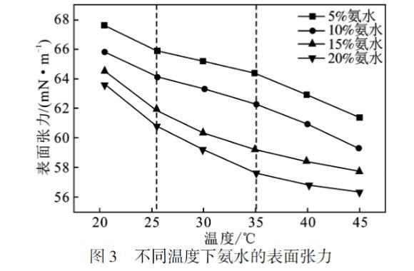 (2)隨著溫度升高,不同濃度下的氨水表面張力值均呈下降趨勢,且下降過程可分為3個階段。溫度小于35℃時,各濃度下前兩階段下降趨勢相似,降幅先大后小;35~45℃范圍,5%和10%的氨水表面張力值降幅增加,而15%和20%的氨水表面張力值降幅減小,并趨于穩定。