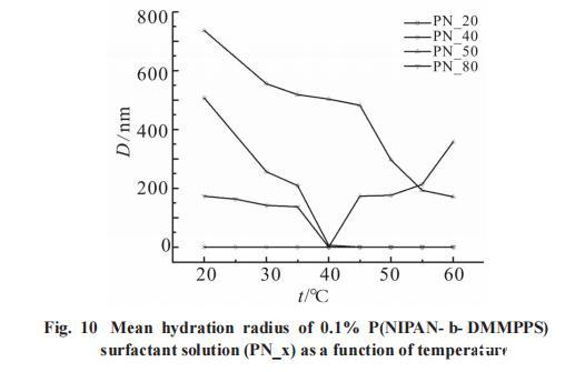 為深入研究P(NIPAN-b-DMMPPS)嵌段聚合物在水溶液中的溫度響應特性,本文利用激光納米粒度儀對PN_20,PN_40,PN_50,PN_80和PN_100這5種不同組成的聚合物樣本進行了分析,特別關注了它們的水合半徑隨溫度變化的情況。測量結果見Fig.10。