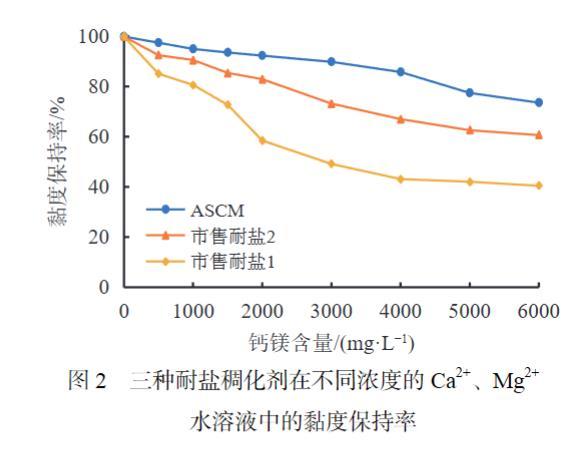 模擬蘇里格氣田水中Ca2+、Mg2+含量,配制鈣鎂總量在500~6000 mg/L的二價鹽水溶液,分別評價ASCM和兩種市售耐鹽稠化劑的耐鈣鎂離子的能力,結果如圖2所示。ASCM耐鈣鎂離子的能力明顯優于另外兩種耐鹽稠化劑,當鈣鎂總量達到3000 mg/L時黏度保持率在90%左右,鈣鎂總量達到6000 mg/L時黏度保持率在70%以上,耐鈣鎂能力達到6000 mg/L。這是由于ASCM結構中的雙尾疏水單體在微疏水作用下賦予聚合物分子鏈良好的延展性和柔韌性,促使聚合物在高鹽水中快速舒展溶脹,同時含有的季銨鹽陽離子、磺酸基團能夠有效減弱高濃度Ca2+、Mg2+對聚合物的屏蔽作用,有利于形成更多的氫鍵結構,在分子鏈間提供更多的物理“交聯位點”,保持較大的流體力學體積,提高在鹽水中的增黏效果。