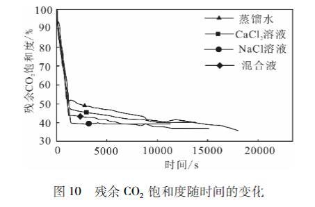 活塞式驅替階段:驅替液突破巖心前,驅替過對巖心中CO2的推擠,將巖心中大部分不受毛細力控制的CO2氣體排出,驅替出的CO2氣量大,殘余CO2飽和度隨時間迅速減小。攜帶驅替階段:驅替液突破巖心后,巖心中的大部O2氣體已被驅出,驅替液只能裹挾出受毛細制較弱的部分氣體和殘留的小部分自由氣體,所以從巖心中驅替出的CO2迅速減少,殘余CO2飽和度隨時間減小的速率也大大降低,隨著巖心CO2氣體不斷減少,殘余CO2飽和度最終趨于定。不同溶液驅替條件下殘余CO2飽和度趨于的速率由大到小依次為:10%CaCl2溶液、%NaCl溶液、蒸餾水。第二階段對最終的殘余CO2飽和度貢獻很小。本實驗所使用的是飽和了CO2的驅替液,所以不存在Li等實驗中的殘余飽和度曲線的溶解式驅替階段。