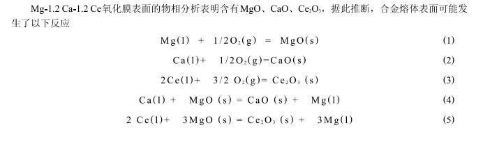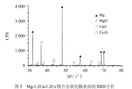 從式(9)、(12)、(15)可知,從熱力學上講,在氧化開始時Mg、Ca和Ce 3種元素均有可能發生氧化;從式(16)、(17)、(18)可以看出,由于活度的影響,式(4)、(5)、(6)所述的置換反應在元素分布均勻的情況下不可能發生;從式(8)、(11)、(14)各氧化物分解壓的計算,MgO、CaO和Ce_2 O_3分解壓的大小順序為:PMgO^0>PCaO^0>PCe,O^0.此外,對氧化膜進行X射線衍射結果表明(圖5),氧化膜中并未出現新的復雜氧化物,可見MgO、CaO和Ce_2 O_3是互不固溶的.按熱力學規律,此時合金將分層氧化,即氧化膜外層氧壓高生成的氧化物其分解壓也大,氧化膜內層氧壓低生成的氧化物其分解壓也小。所以Mg-1.2 Ca-1.2 Ce來說,將按照這樣的順序來氧化:最外層是MgO,其次是CaO,最內層是Ce_2 O_3.至此,初始的保護性氧化膜形成.