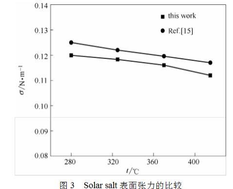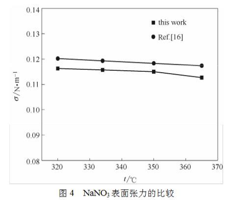 在此基礎(chǔ)上,對(duì)單組分NaNO3和混合熔鹽Solar salt(60%NaNO3+40%KNO3,質(zhì)量分?jǐn)?shù))的表面張力進(jìn)行驗(yàn)證。Solar salt和NaNO3的表面張力測(cè)量結(jié)果分別與文獻(xiàn)中的值比較,結(jié)果如圖3和圖4所示。