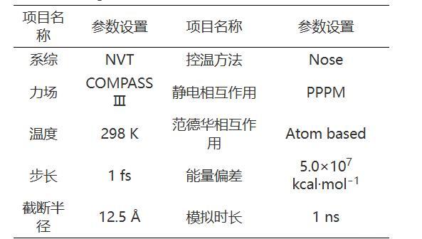 分子動力學模擬過程由Forcite模塊完成。初始泡沫體系的結構并不穩定,需對泡沫初始模型進行結構優化以獲得穩定的低能量泡沫結構。在分子動力學模擬開始前,利用Forcite模塊中的Anneal對幾何優化后的泡沫模型進行退火操作。利用Dynamic進行分子動力學模擬,系綜、力場、溫度等相關參數設置情況見表1。