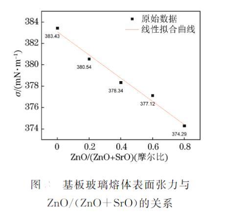 圖 7 基板玻璃熔體表面張力與 ZnO/(ZnO+SrO) 的關(guān)系