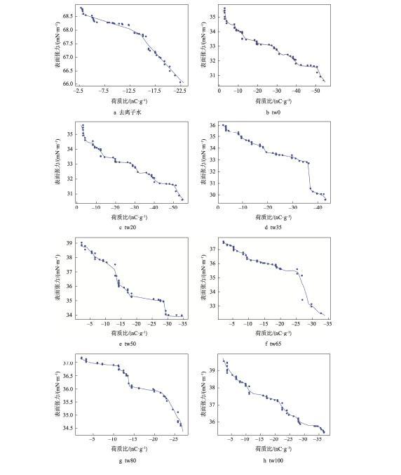 荷電使得液滴的接觸角顯著降低(P<0.05),其中7kV的電壓能夠使去離子水液滴的接觸角降低約10°,明膠液滴接觸角下降約6°~9°。茹煜等建立了荷電霧滴的三維運動模型,發現在20kV的電壓下熒光液滴的接觸角能夠降低46°。本研究發現,當表面活性劑吐溫20與司盤20的濃度比為1:1(tw50),外加電壓為7kV時,明膠液滴在石蠟表面具有最好的潤濕性,接觸角為64.99°。